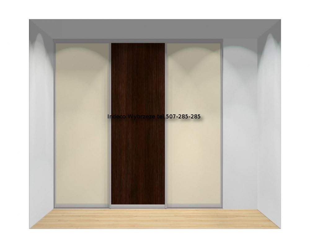 - jedno skrzydło z wypełnieniem z płyty meblowej, dwa skrzydła z wypełnieniem z kolorowego szkła.